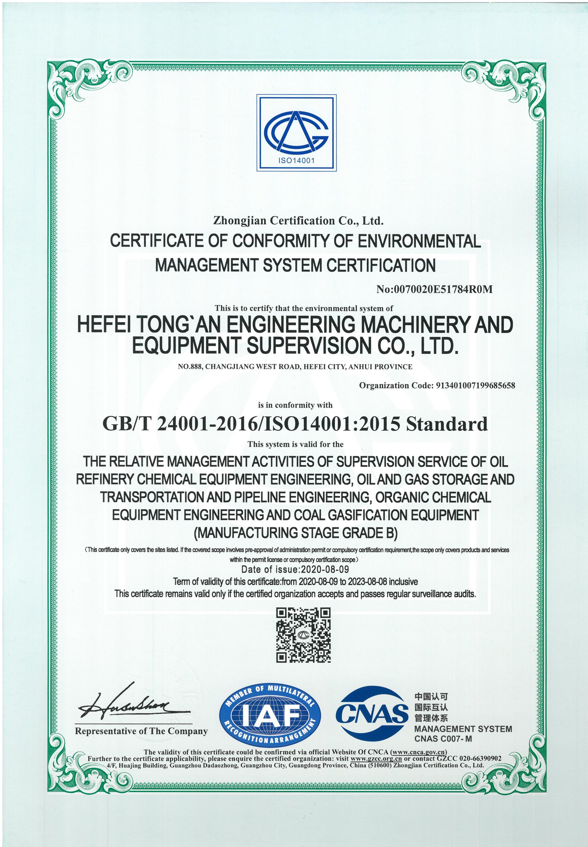 環(huán)境管理體系認(rèn)證證書(shū)