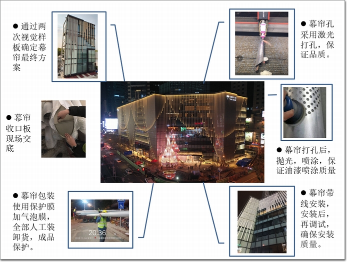 外幕簾的視覺沖擊決定了高品質(zhì)完成幕簾安裝是施工的重難點(diǎn)。金螳螂團(tuán)隊通過視覺樣板安裝,反復(fù)觀樣,確定簾幕的最終方案。由于地處鬧市,且是舊樓改造項(xiàng)目,施工現(xiàn)場外圍幾乎無材料堆場,施工場地狹小,各專業(yè)同時施工,施工場地成了各家必爭之地。金螳螂團(tuán)隊以公司為中轉(zhuǎn)場地,合理安排材料進(jìn)場時間,進(jìn)場材料及時消化,安裝上墻。同時積極主動配合業(yè)主單位協(xié)調(diào)工作,劃分各單位專用室內(nèi)臨時堆場,高效利用有限的臨時場地,積極推動項(xiàng)目進(jìn)度。