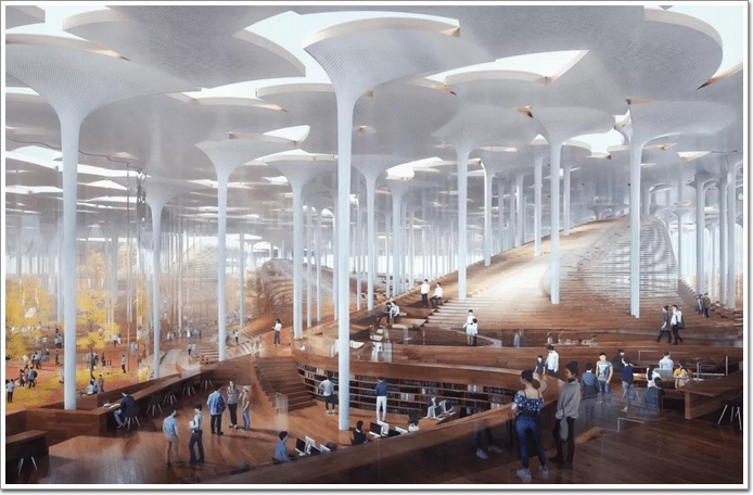 圖書館內(nèi)部將呈現(xiàn)“山谷門廳”的景致。讀者在圖書館任意一個公共區(qū)域,都能看到外面的園林綠化景觀,蜿蜒的主通道兩側(cè)區(qū)域形似山坡上的梯田,每一層都可供市民閱讀休閑,讓大家享受“臨山間于樹下”的閱讀體驗。