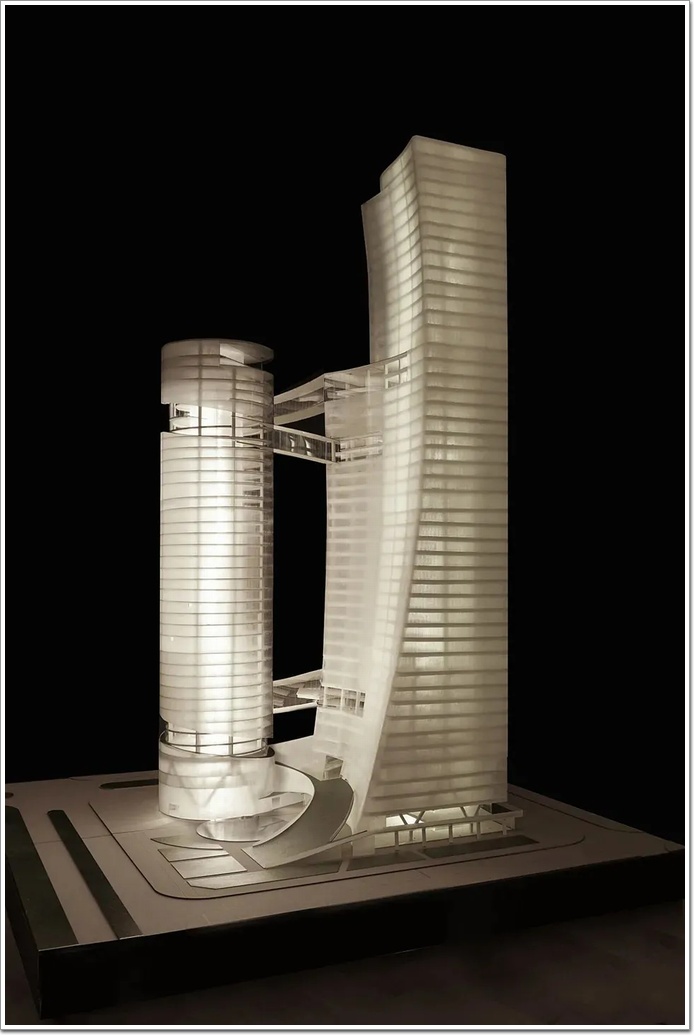 一座為住宅、高150米;一座為寫字樓、高達(dá)200米,包含辦公,實(shí)驗(yàn)室和公共接待處。