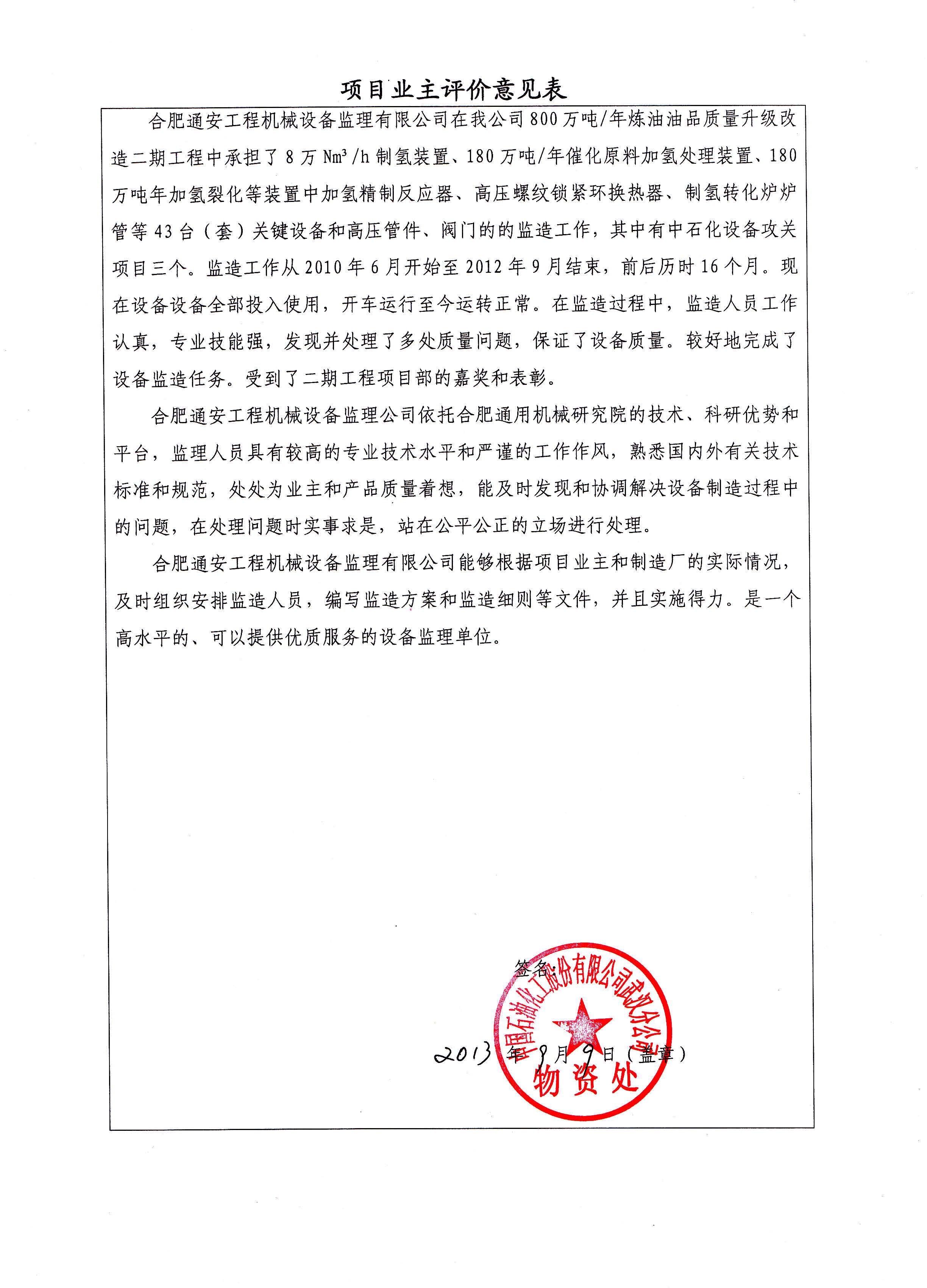 來(lái)自武漢石化800萬(wàn)噸/年煉油油品升級(jí)改造二期工程業(yè)主的感謝信