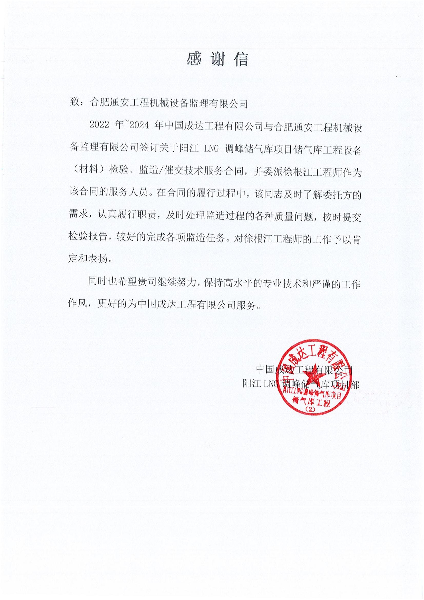 中國成達工程有限公司感謝信