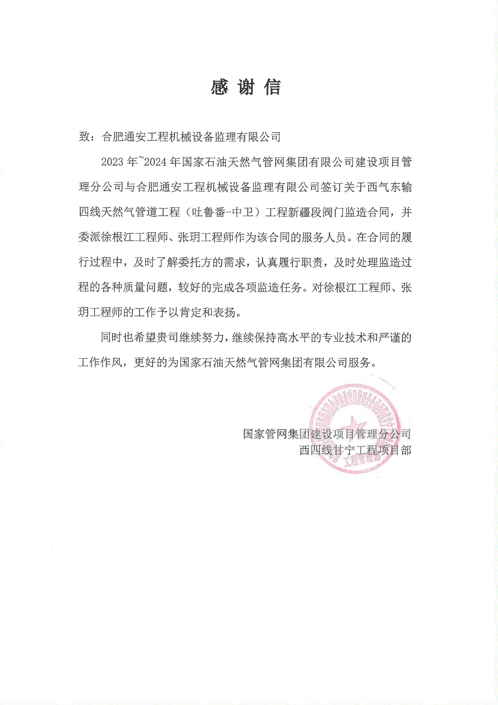 國家管網西四線新疆段感謝信