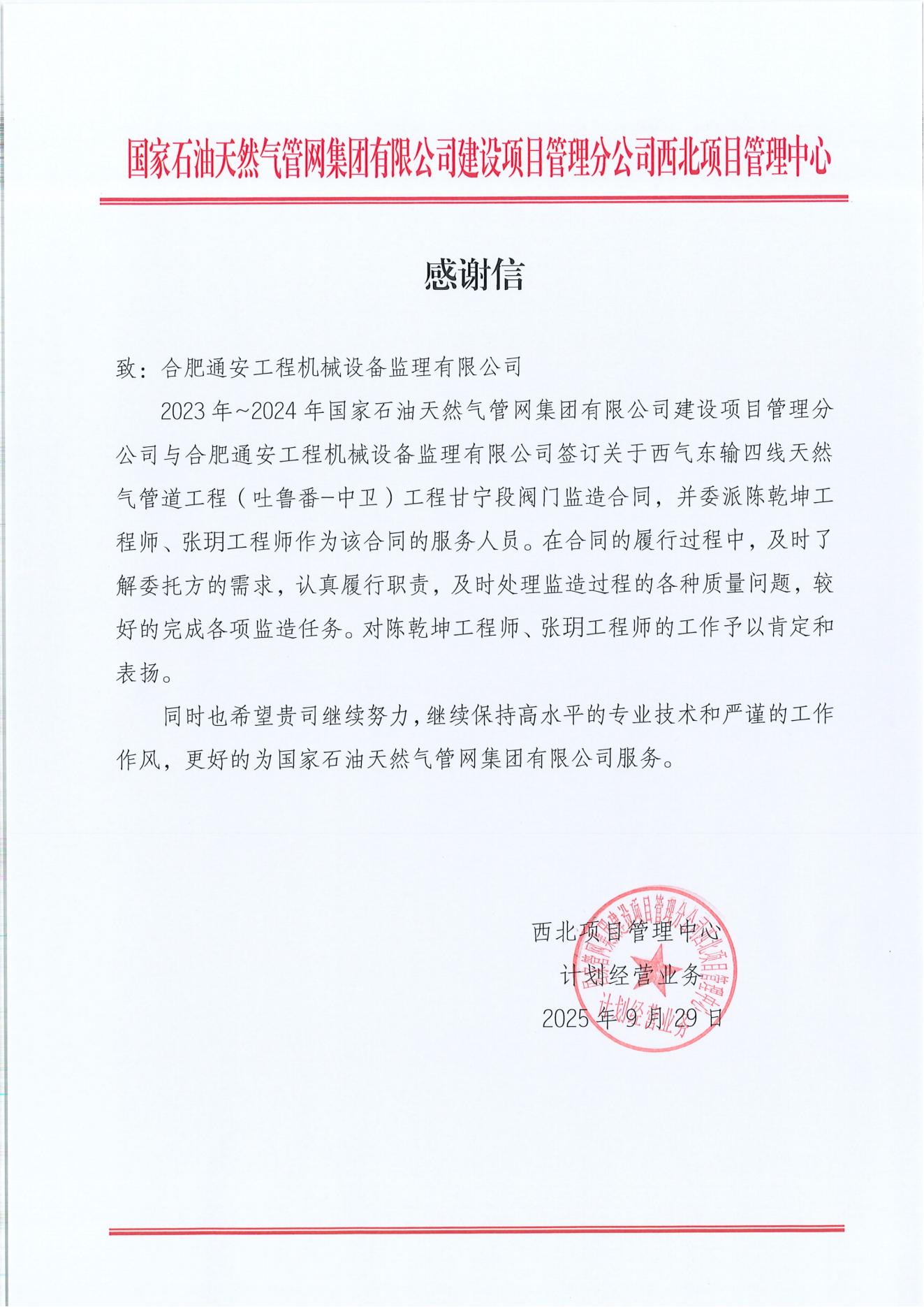 國家管網(wǎng)建管分公司西北項目管理中心感謝信