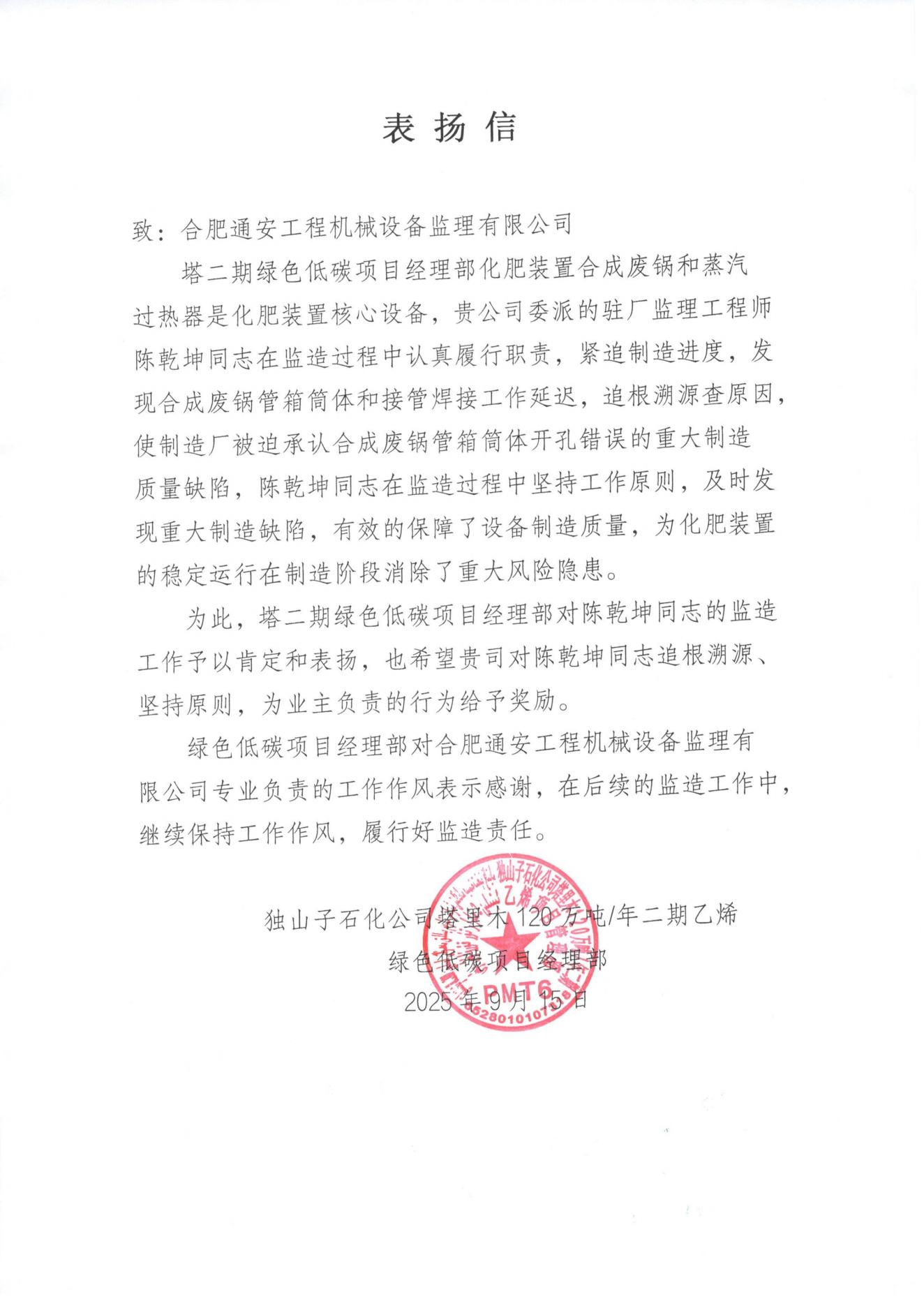 獨(dú)山子石化感謝信