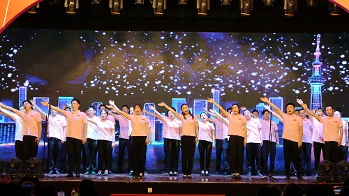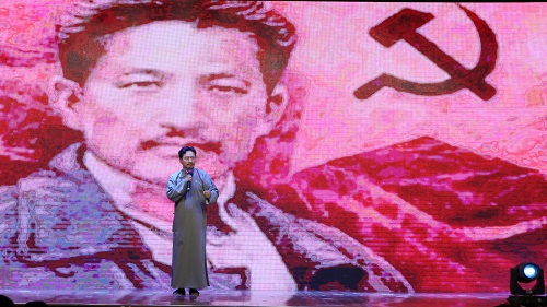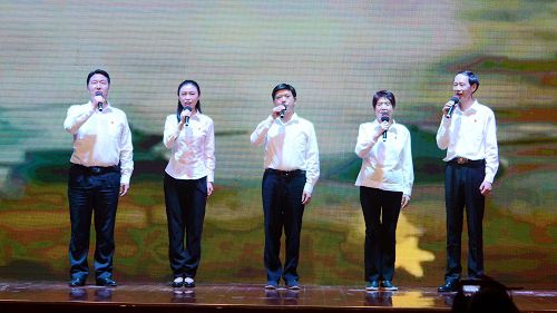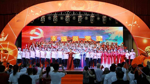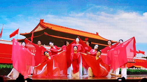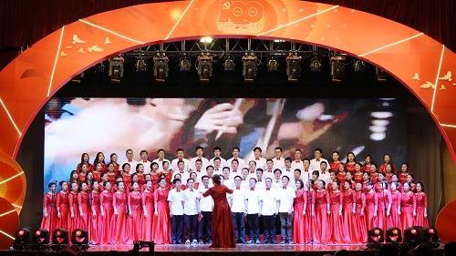 演出的最后,全場(chǎng)人員一同揮舞著手中的黨旗,共同唱響《沒(méi)有共產(chǎn)黨就沒(méi)有新中國(guó)》。雄壯有力的歌聲經(jīng)久不息,為建黨100周年獻(xiàn)上最真摯的祝福。